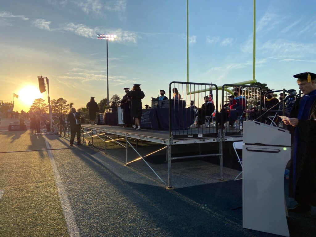 The Charleston Southern University Class of 2020 members had their chance to walk the stage April 30 on CSU’s Buccaneer Field, and the Class of 2021 walked May 1. COVID-19 disrupted the traditional May graduation for the Class of 2020. CSU held a virtual graduation for the class last May and an in-person diploma pick-up and photo opportunity with President Dondi Costin.