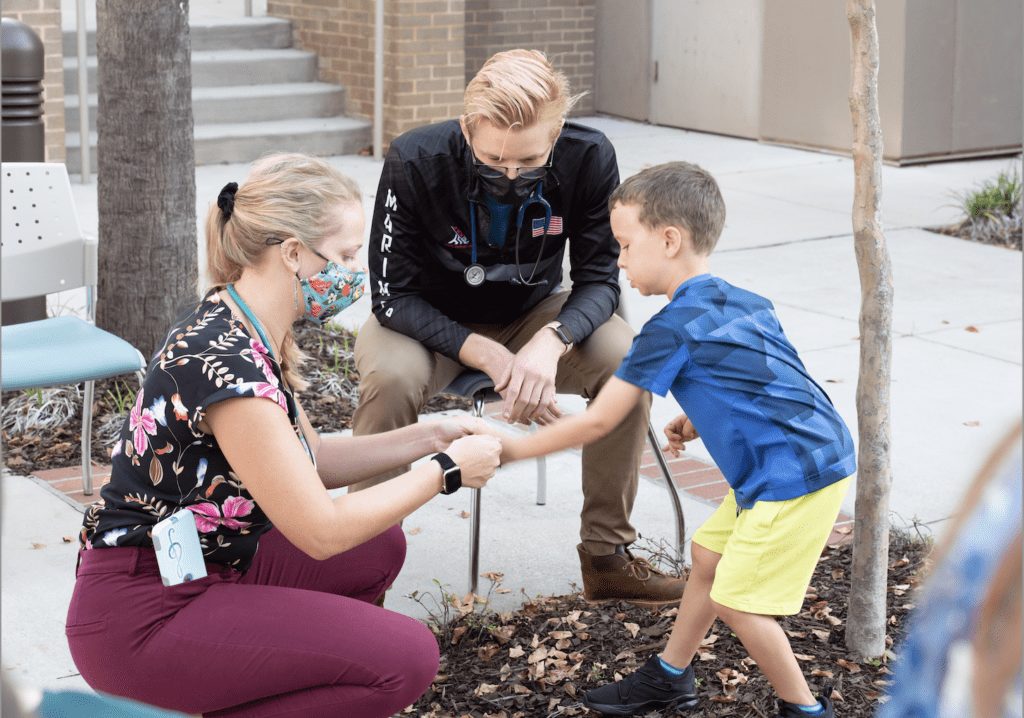 Physician assistant students at Charleston Southern University participated in COVID-safe pediatric examinations on Friday—outside of the Health Science building. Every fall semester, the PA program offers a Fundamentals of Pediatrics course that focuses on teaching how to approach the well child visit, including developmental milestones, immunizations, screenings, and physical exams. Children of CSU faculty members volunteered.