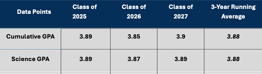 - Science GPA: The program strives to maintain a 3-year running average on a science GPA of 3.3 or higher.