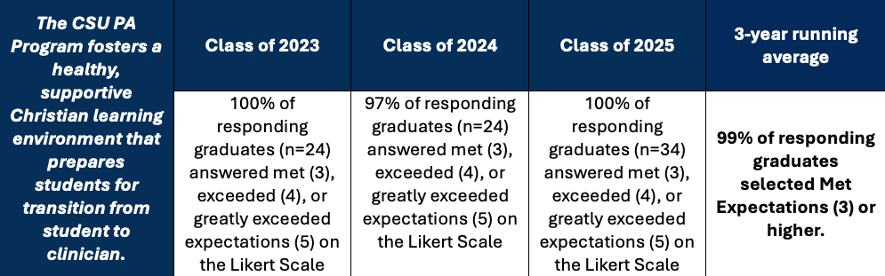 - Q2-The CSU PA Program fosters a healthy, supportive Christian learning environment that prepares students for transition from student to clinician.