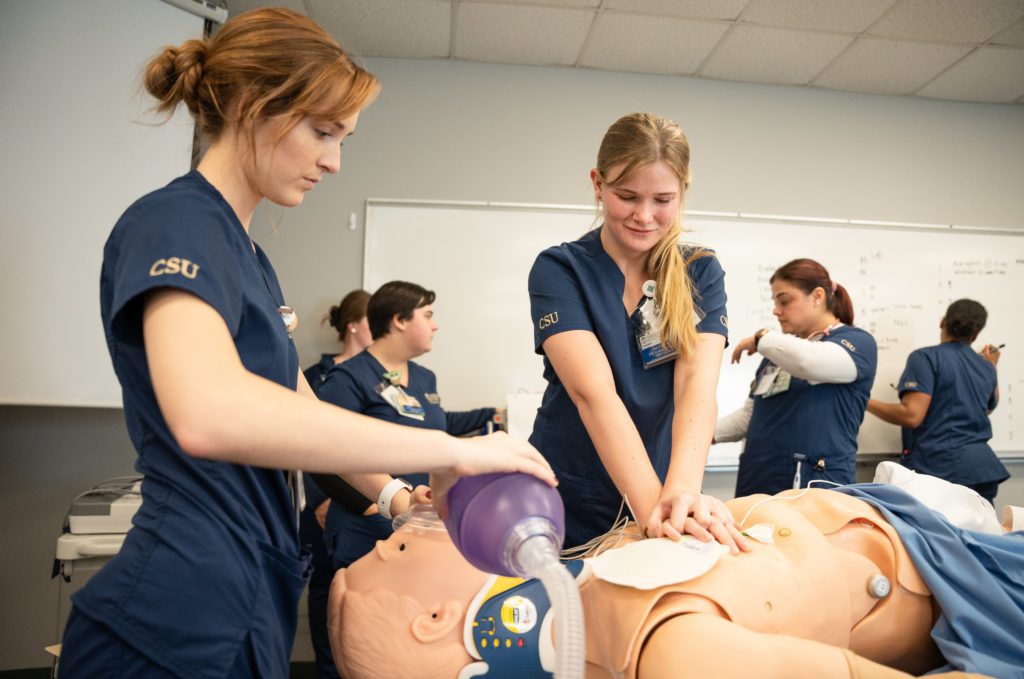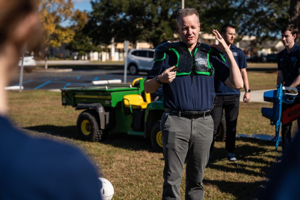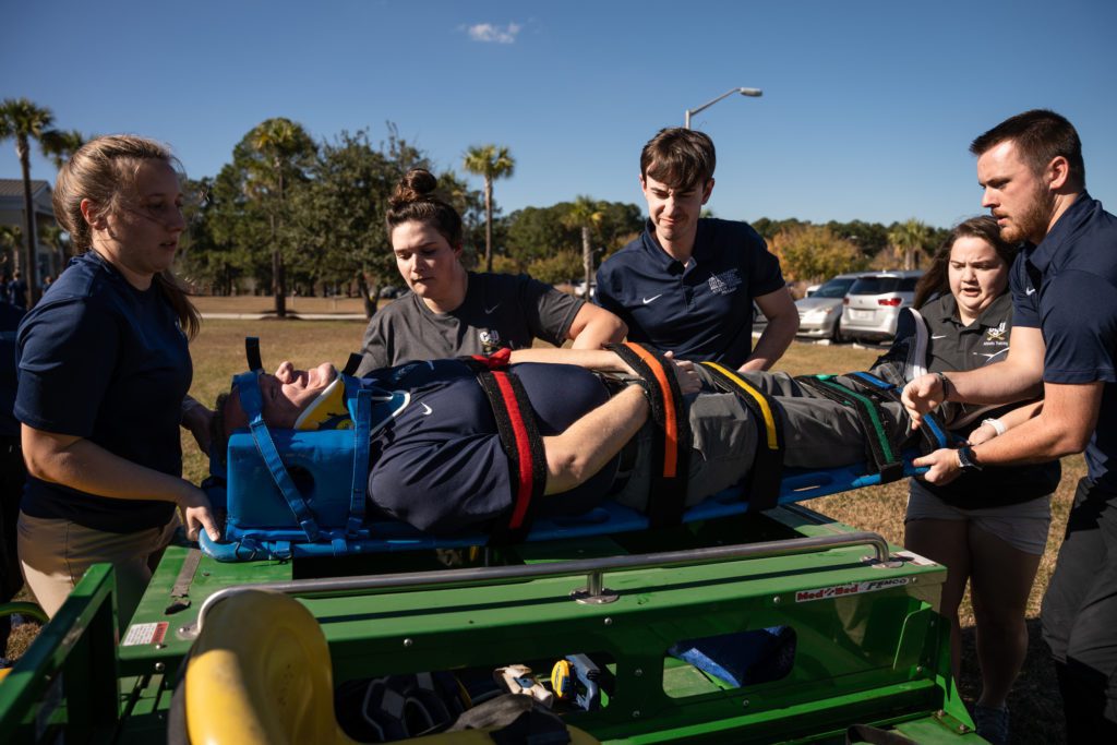 Each year, CSU’s healthcare programs partner with an on-site simulation, learning to work with other healthcare personnel, simulating a real-world situation. This year’s simulation involved athletic training students assisting an athlete hurt on the field, including assessing the situation, stabilizing the athlete and transporting him to the emergency room. Nursing students take over in recording the information known about the patient, begin an assessment and treatments. The simulation ends with a debriefing exercise with professors and students going over what went well and what could have been better.